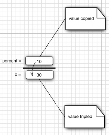 Ama percent değeri hala 10'dur çünkü biz parametreye dediğimiz gibi referans geçmedik çünkü Java'da sadece call by value vardır ve percent'ın değeri tek x'e atanır referansı değil bu yüzden percent değeri 10 olarak kalmıştır.